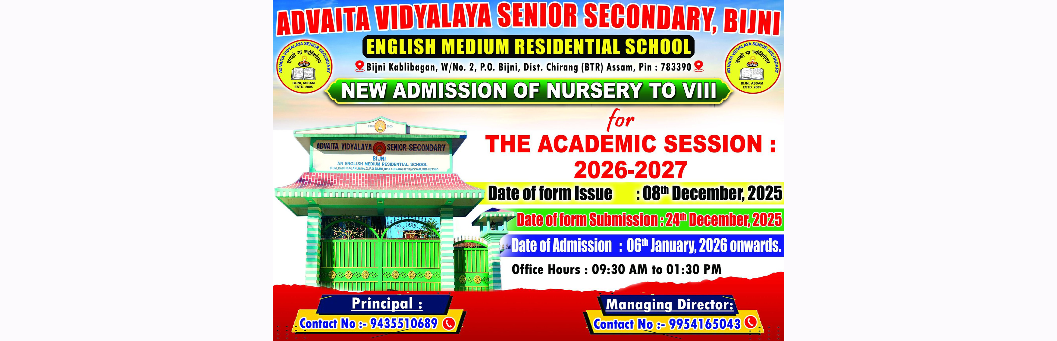Read MoreAdvaita Vidyalaya Sr. Secondary , Bijni was founded in the year 2005 at Kablibagan, ward No. 2 , Bijni, Dist, Chirang. This institute is a Co-educational residential School, which provides a rich, diverse and challenging education through innovation teaching and learning and inspires each one to achive their best. Our Motto is - 'Tamaso. . . > > >
